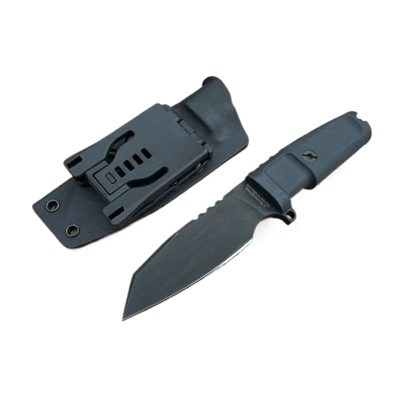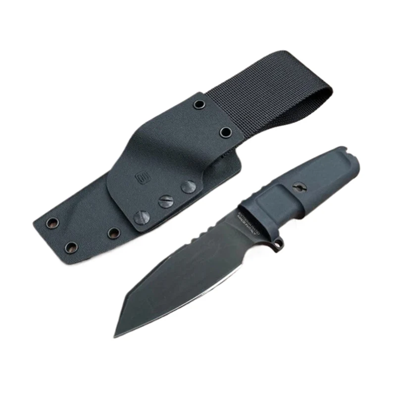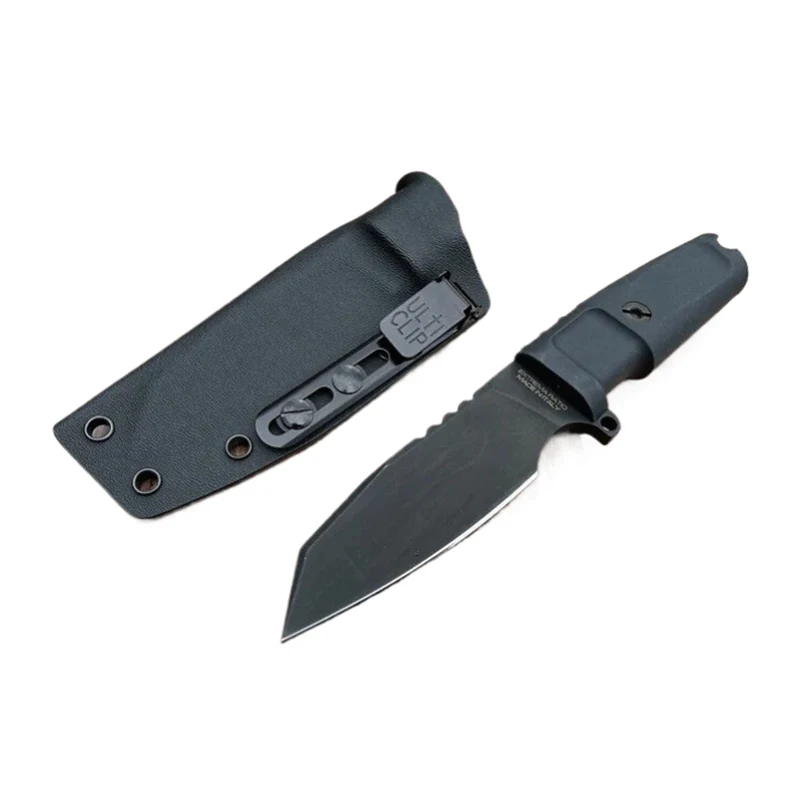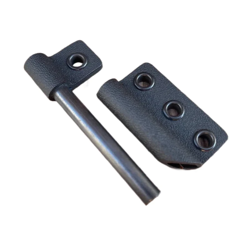 Chun an scian cothrománach a cheangal leis an gcreasa ar an mbealach traidisiúnta, go cothrománach nó go hingearach, is gnách go roghnaíonn mo chustaiméirí Il-Lok. Más mian leat an scian a iompar beagán níos ísle, molaim strap níolón le sealbhóir Kydex. Tá Velcro iontach chun an scian a iompar trasna an chreasa. Is réiteach praiticiúil é an Velcro freisin chun an scian a cheangal le strap an mhála droma. Chomh maith leis an sheath Kydex, is féidir liom sealbhóir cruach dóiteáin a cheangal, go roghnach le cruach dóiteáin (fad 80mm).